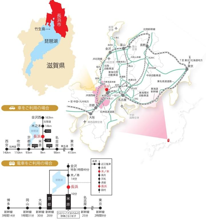お車でお越しの方は、北陸自動車道 長浜ICまたは小谷城SICまたは木之本ICまでお越しください。